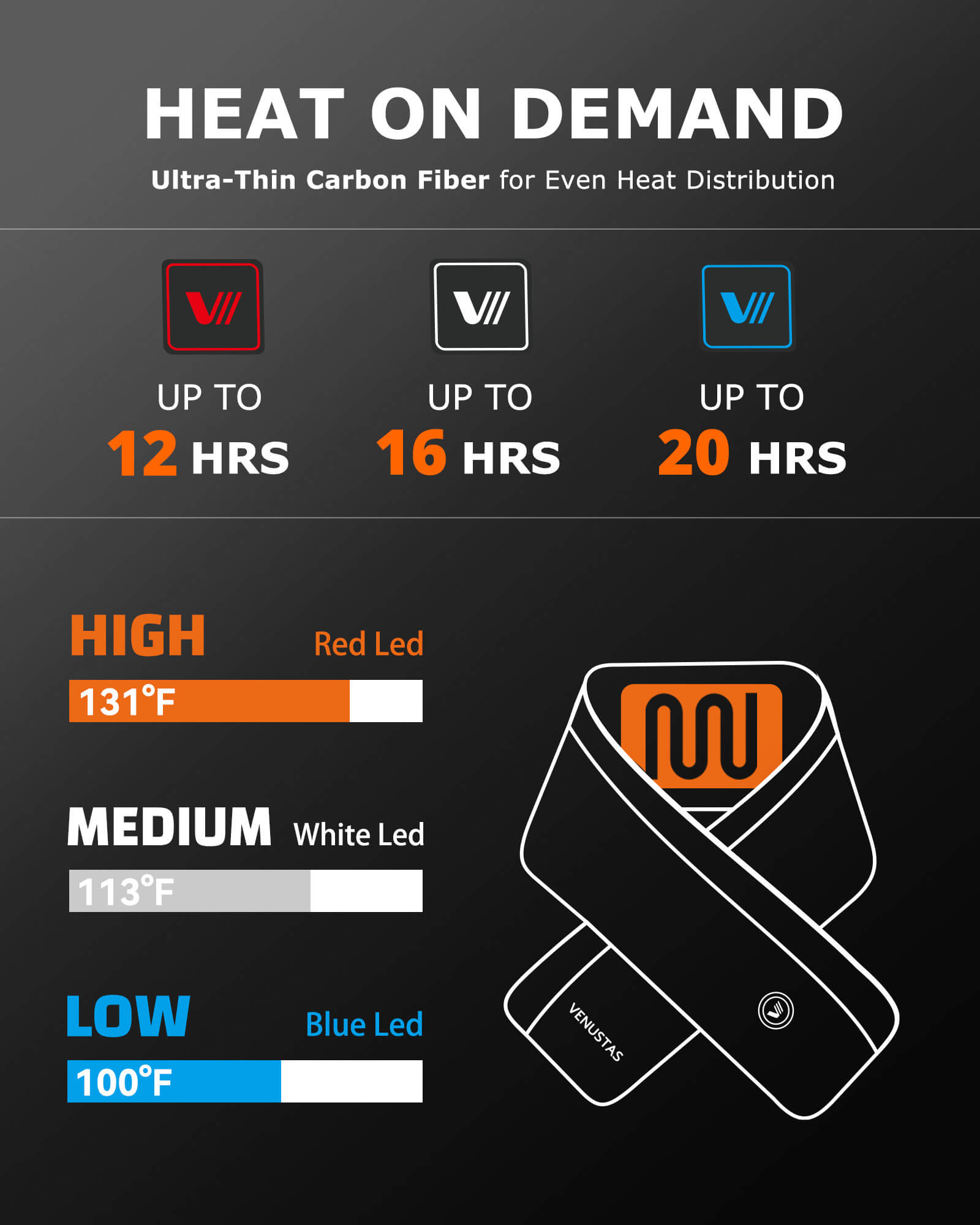 • Premium carbon fiber heating elements target the neck area with three adjustable heat settings (High/Medium/Low). It preheats in seconds, giving you instant relief from the chill.